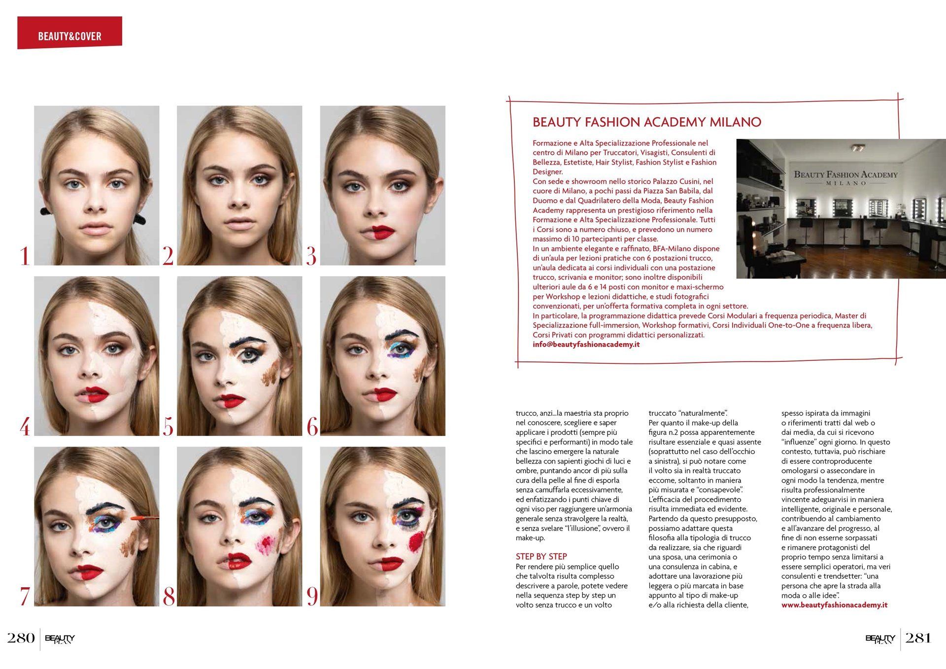 it has a classroom for practical lessons with 6 make-up stations, a classroom dedicated to individual courses with a make-up station, desk and monitor; there are also additional 6 and 14-seat classrooms with monitors and maxi-screens for workshops and educational lessons, and affiliated photographic studios