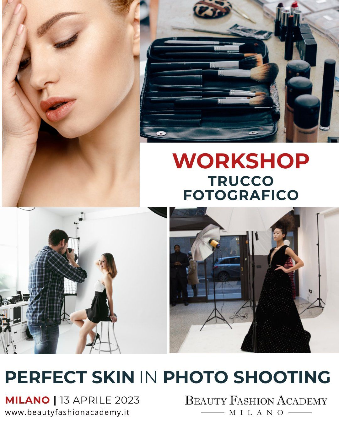 tra basi teoriche e dimostrazioni pratiche per apprendere le tecniche di truccatura più efficaci da utilizzare per servizi fotografici di ogni genere, e scoprire tutti i segreti al fine di ottenere con il trucco una base perfetta e una resa ottimale del makeup in fotografia anche sulle pelli più complesse, ottenendo basi compatte, luminose e naturali partendo dalla tecnica di stesura del fondotinta in base alla tipologia dei prodotti fino alla dimostrazione del metodo per ottenere fondi e correttori personalizzati in base alle tipologie specifiche di discromie ed imperfezioni (occhiaie, borse, acne etc.).