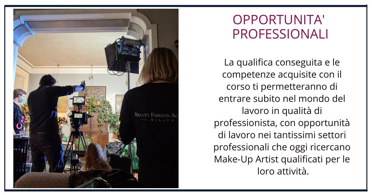 Il Corso è articolato in 25 lezioni da 8 ore ciascuna (6 in versione individuale) , per un totale complessivo di 200 ore (150 ind.) di formazione intensiva full-immersion. Attraverso la trattazione completa e approfondita di tutte le materie concernenti la truccatura professionale contemporanea, conferisce le competenze tecniche e la cultura necessaria a lavorare come Make-Up Artist in numerosissimi ambiti commerciali e privati quali ad esempio servizi fotografici / videoclip, programmi televisivi / fiction / serie tv, spettacoli teatrali, produzioni cinematografiche, beauty store, eventi moda, eventi privati / cerimonie, collaborazioni con Aziende cosmetiche nonchè tutte le attività connesse al web.
