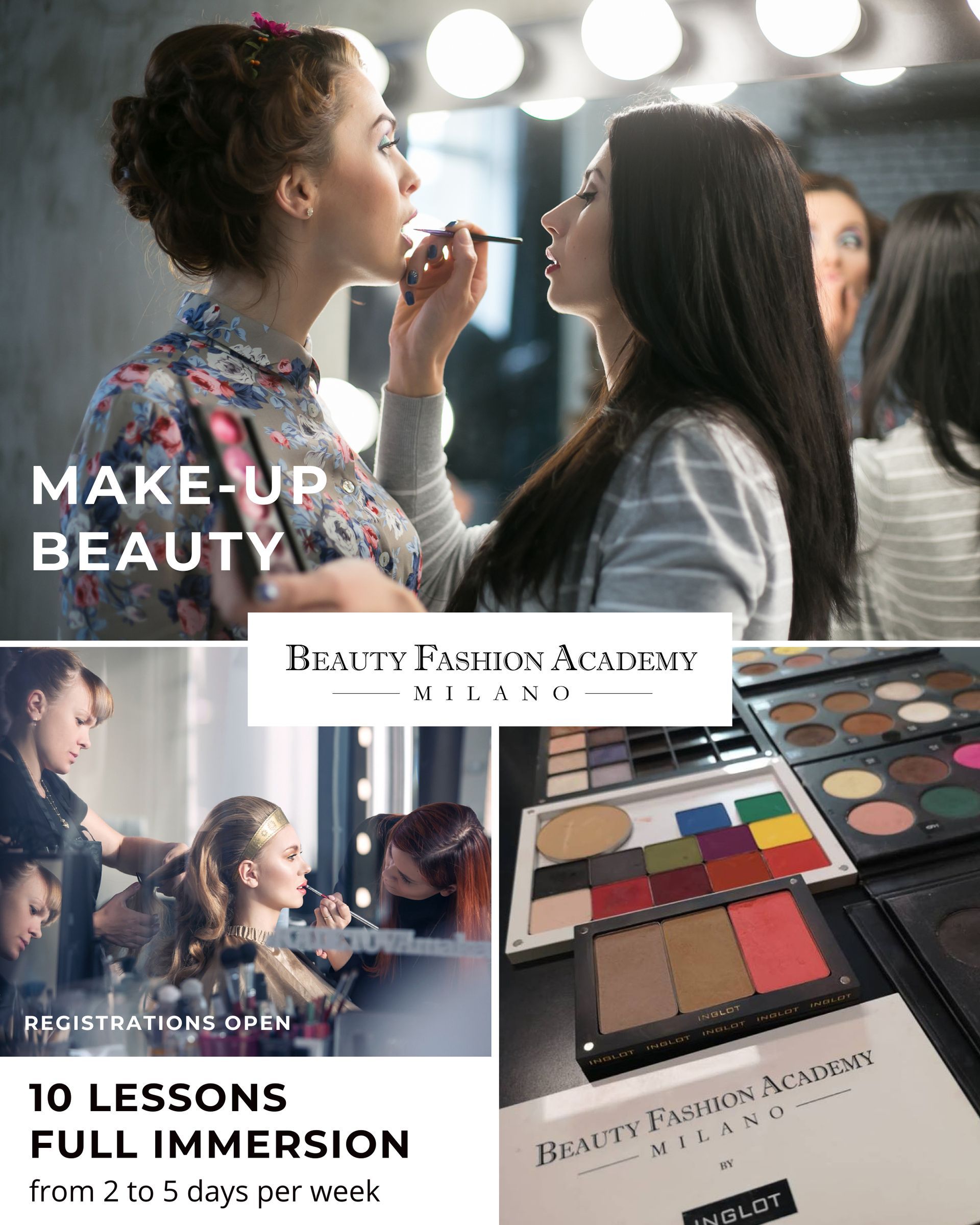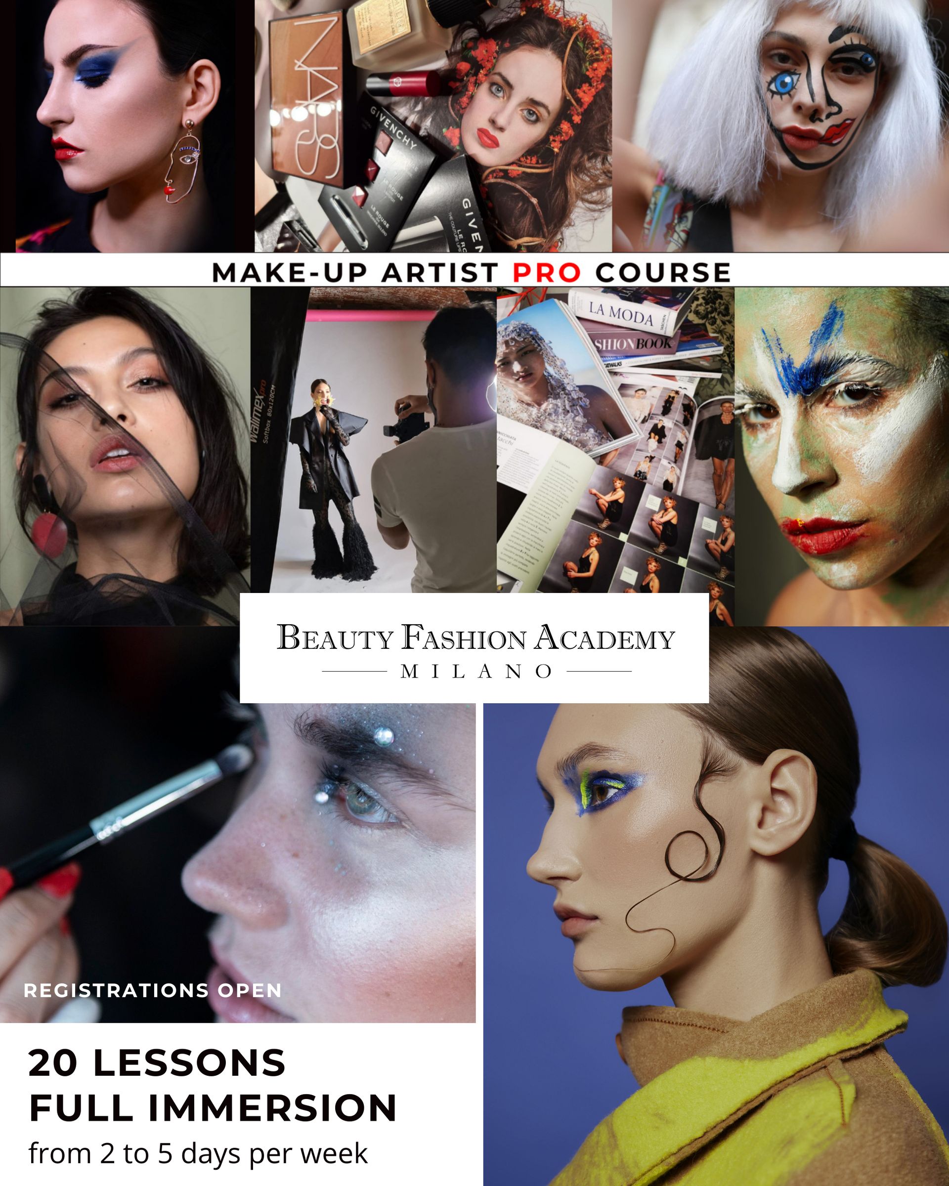 Starting from the basics, through a particularly comprehensive training program, you will learn all the necessary knowledge of contemporary professional makeup, progressing to specialize in the latest makeup techniques used in the fashion industry, photo sessions, and visual communication.