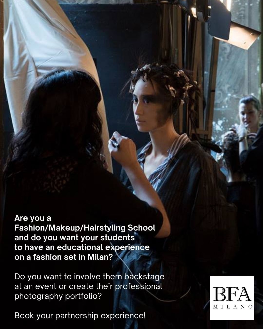 in other Countries: through these partnerships, it is possible to configure important and prestigious training and refresher experiences or professional specialization, guaranteeing new and rewarding growth opportunities for your students, using our teachers and our educational programs applied to professional sets exclusively directly in the center of Milan and/or on the occasion of particular events such as Milan Fashion Week and Milan Design Week.