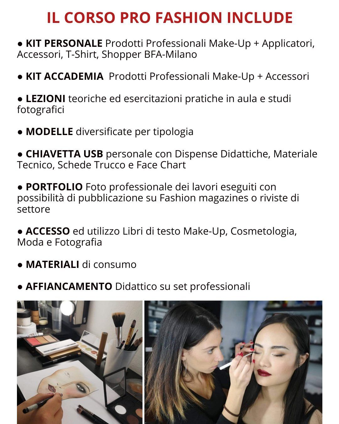 Il programma didattico prevede anche l'integrazione di eventi speciali con la presenza e gli interventi in aula di Fashion Make-Up Artist ed Hair Stylist di fama ed esperienza internazionale, Fotografi di Moda, Stylist, Fashion Designer, Brand Ambassador, Make-Up Influencer , titolari e/o rappresentanti di Aziende produttrici di prodotti Make-Up e Cosmetici, che incontreranno e interagiranno con gli allievi in lezioni specifiche, e la possibilità per i corsisti di vivere in Team e direttamente "sul campo" una "Professional Experience" nel corso della Milan Fashion Week o Milan Design Week, parte integrante del percorso formativo PRO-FASHION quale principali eventi di riferimento professionale nella Città capitale mondiale della Moda e del Design.